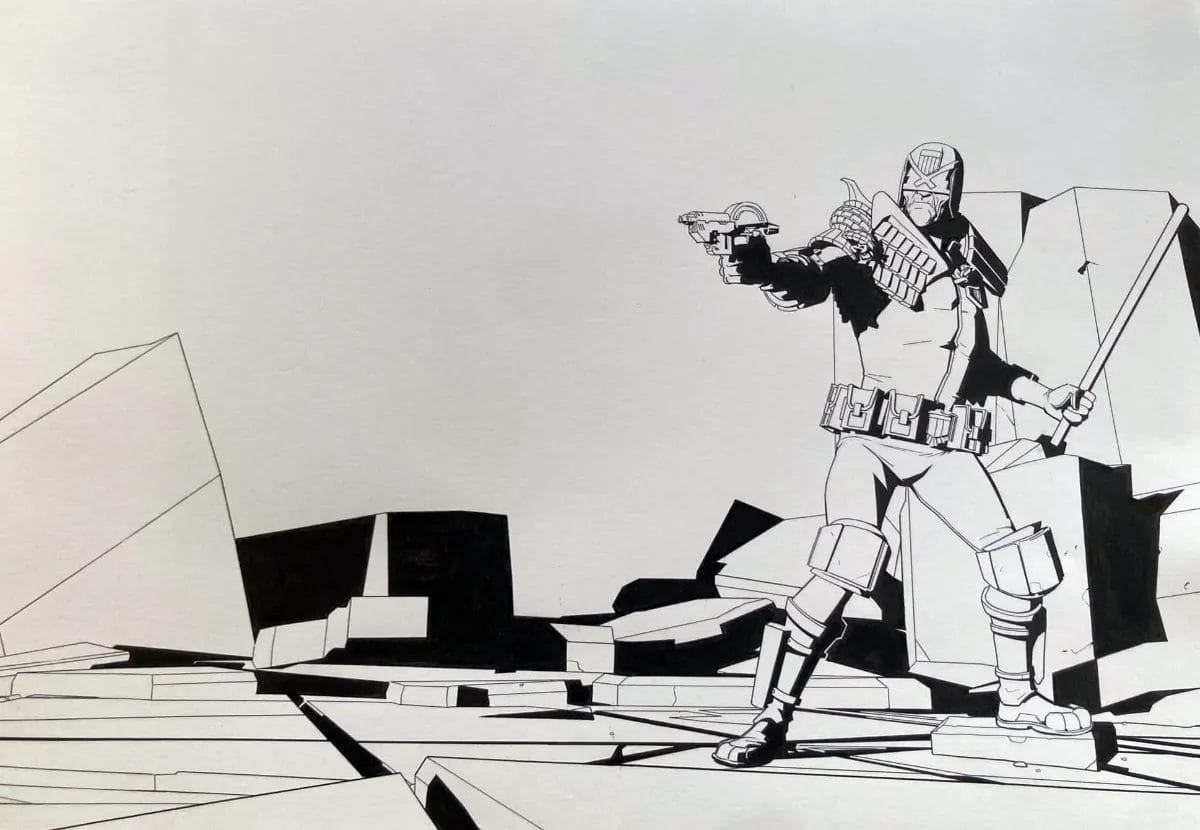 Judge Dredd by Lee Carter in pen and ink on board. Art is approximately 11.7″ x 16.5″ in size.